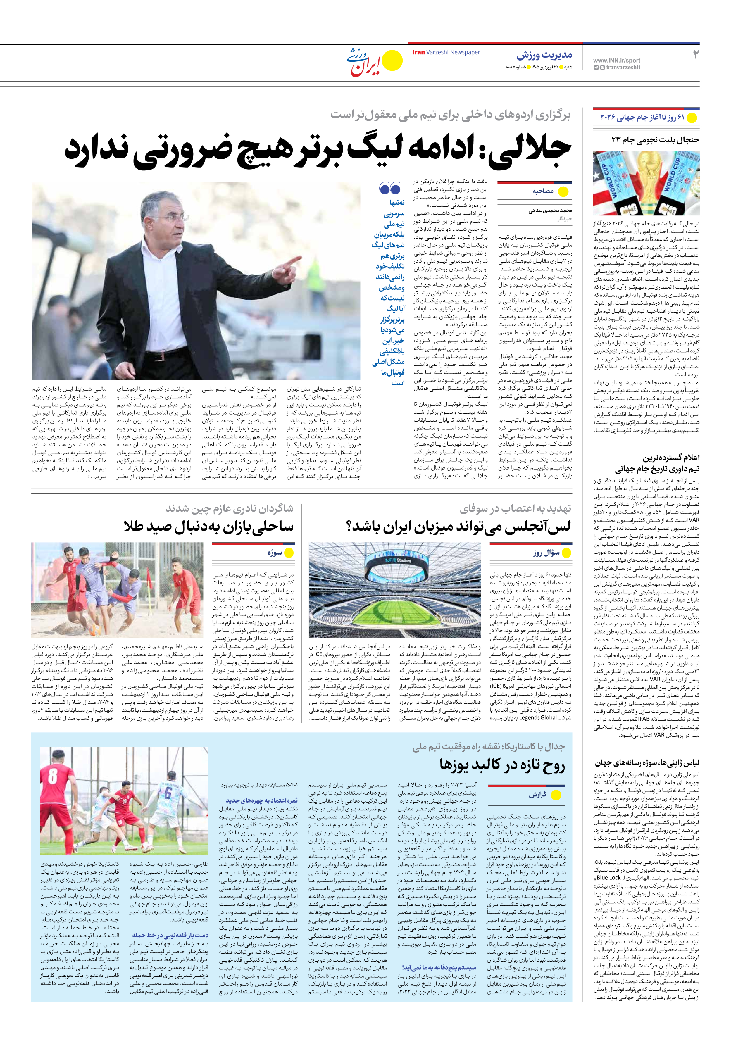 روزنامه ایران ورزشی - شماره هشت هزار و هشتاد و هفت - ۲۲ فروردین ۱۴۰۵ - صفحه ۲