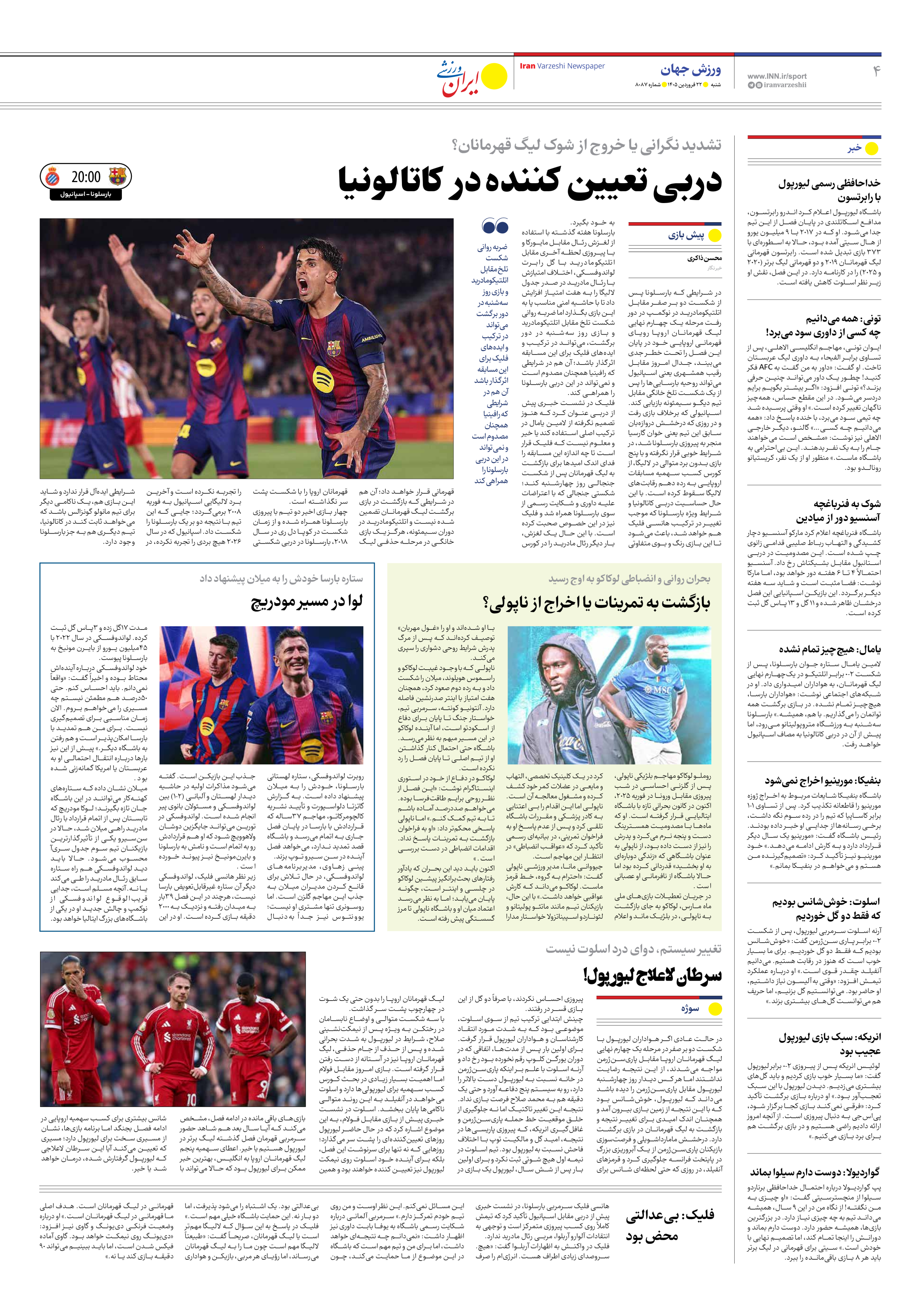 روزنامه ایران ورزشی - شماره هشت هزار و هشتاد و هفت - ۲۲ فروردین ۱۴۰۵ - صفحه ۴
