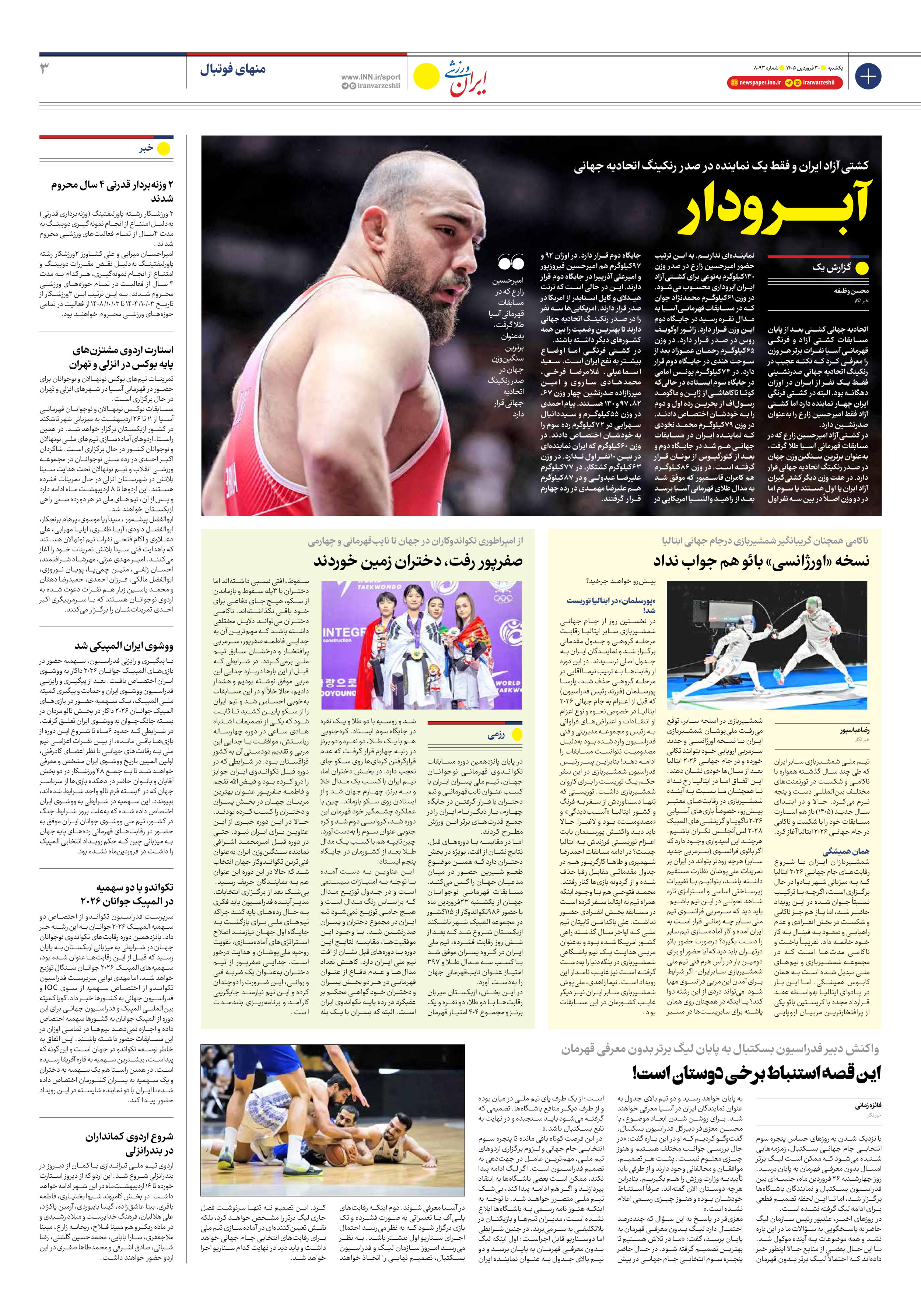 روزنامه ایران ورزشی - شماره هشت هزار و نود و سه - ۳۰ فروردین ۱۴۰۵ - صفحه ۳