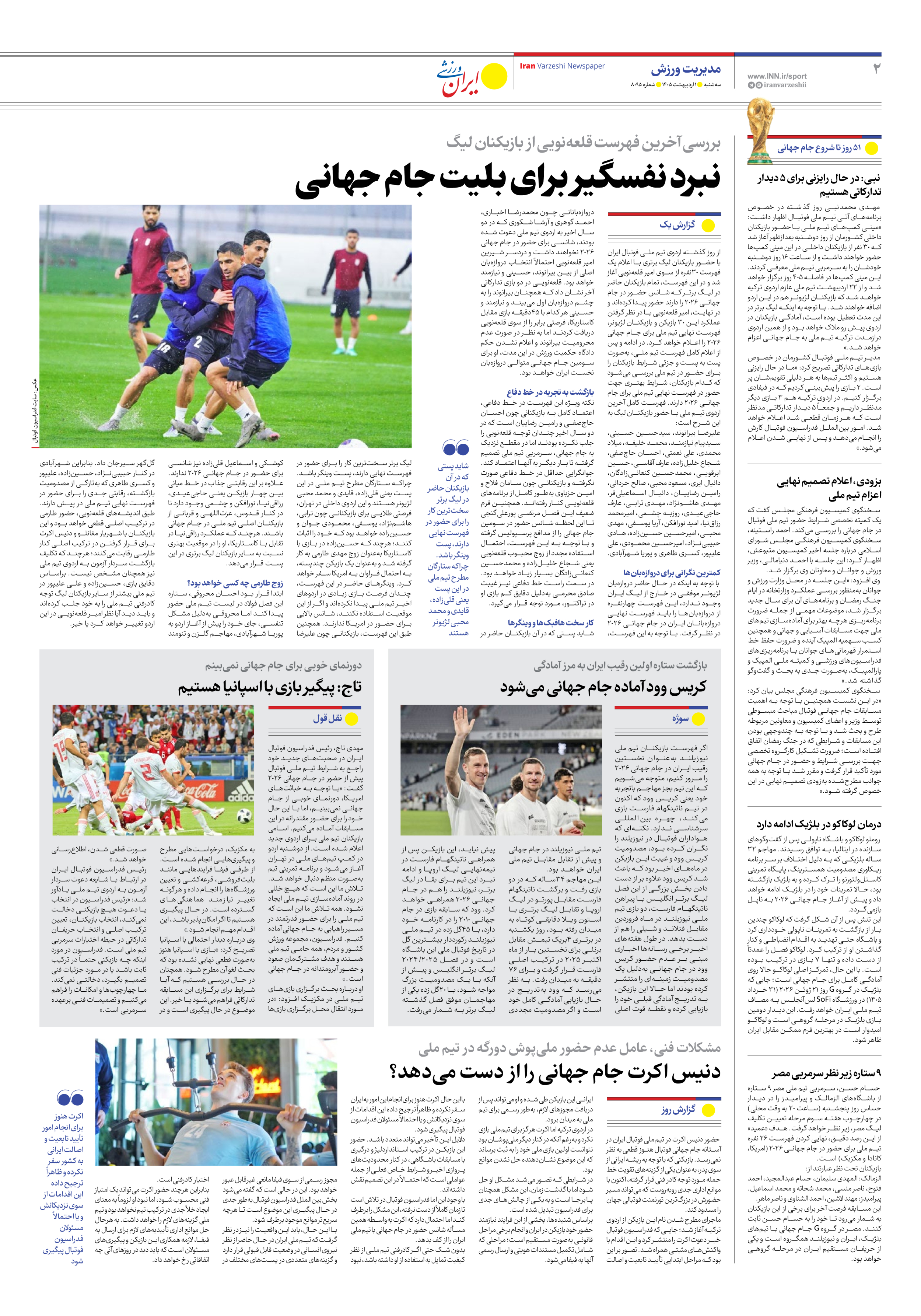 روزنامه ایران ورزشی - شماره هشت هزار و نود و پنج - ۰۱ اردیبهشت ۱۴۰۵ - صفحه ۲
